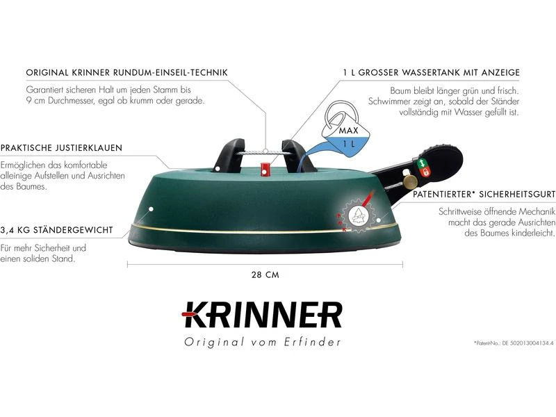 Das Einstiegsmodell Krinner Basic S ist ausgestattet mit der original Rundum-Einseil-Technik. Die durchgehende Seilführung garantiert dabei den gleichmässigen Druck der Klauen an den Stamm. Einfach den Baum in den Ständer stellen, das Fusspedal treten, fertig! Ob dick, dünn oder krumm gewachsen, der Baum steht sicher und kerzengerade.