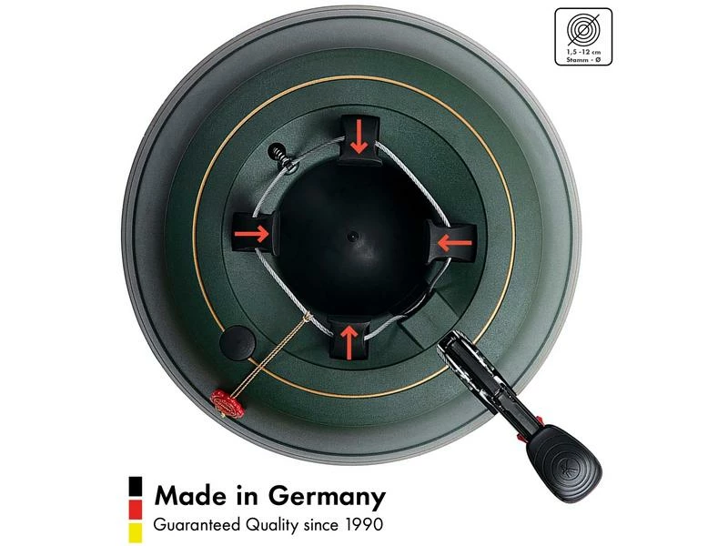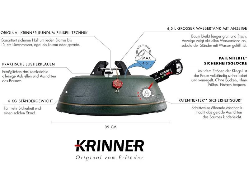 Das neue Pedal des Christbaumständers KRINNER Ultra Grip XL besticht sofort durch seine deutlich grössere Auflagefläche und sorgt damit für optimalen Halt Ihrer Fuss-/Schuhsohle bei Betätigung des Fusspedals. Die durchgehende Seilführung der original Rundum-Einseil-Technik garantiert dabei den gleichmässigen Druck der Klauen an den Stamm. Einfach den Baum in den Ständer stellen, das Fusspedal treten, fertig! Ob dick, dünn oder krumm gewachsen, der Baum steht sicher und kerzengerade. Die patentierte Sicherungsglocke im Fusspedal signalisiert gut hörbar, wenn die Klauen sicher und fest am Baum anliegen und der Verschluss des Fusshebels automatisch eingerastet ist. Damit entfällt ein mühsames Bücken zum Prüfen, ob der Baum fest steht oder um den Fusshebel zu sichern. Zudem sorgt der patentierte Sicherheitsgurt durch seine schrittweise öffnende Mechanik für extra Sicherheit und verhindert ungewolltes Kippen.