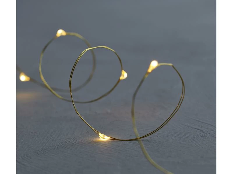 Die batteriebetriebene Lichterkette besteht aus einem ultrafeinen Golddraht, der mit 20 LED-Lichtern bestückt ist. Insgesamt hat die Kette eine Länge von 1,9 Metern und wird mit zwei AA-Batterien betrieben, die nicht zum Lieferumfang gehören. Die Lichterkette dürfen Sie nur im Innenbereich benutzen.