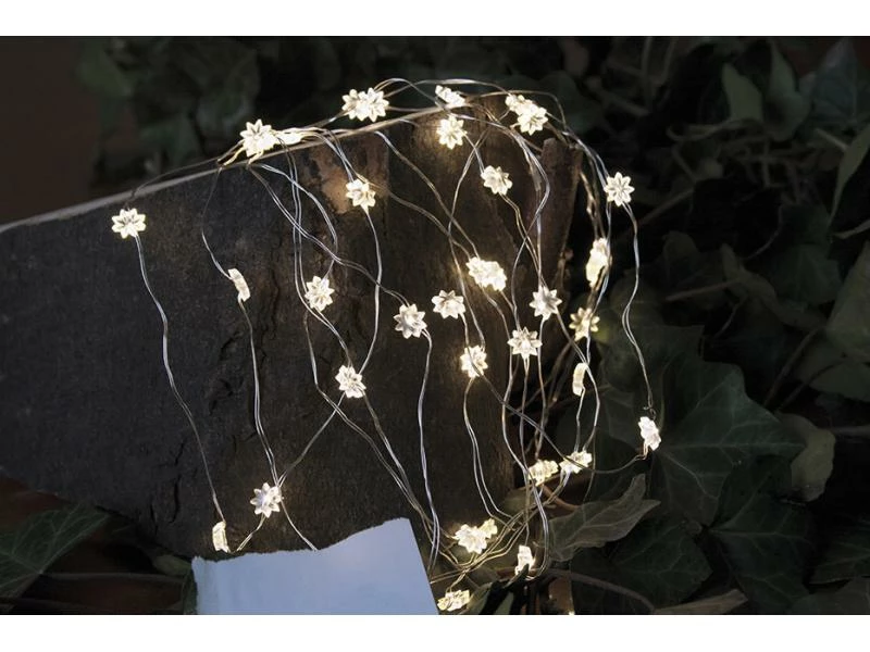 Die Lichterkette besteht aus einem feinen Silberdraht, in dem die Blüten eingearbeitet sind. Mit einer Länge von ca. 3,9 m können Sie Regale oder Glasvasen zu einem hübschen Eyecatcher machen.