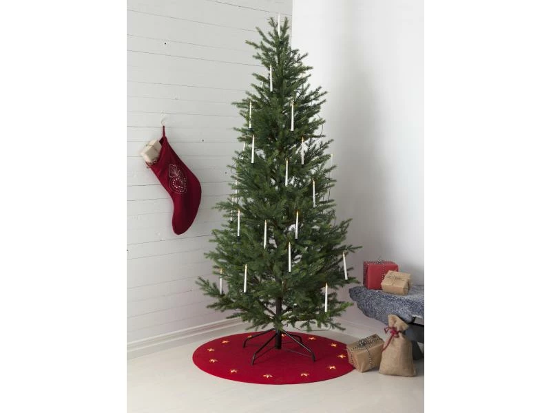 Rote Weihnachtsbaummatte mit 12 LED-Lichtquellen. Schöne Dekoration unter dem Weihnachtsbaum.