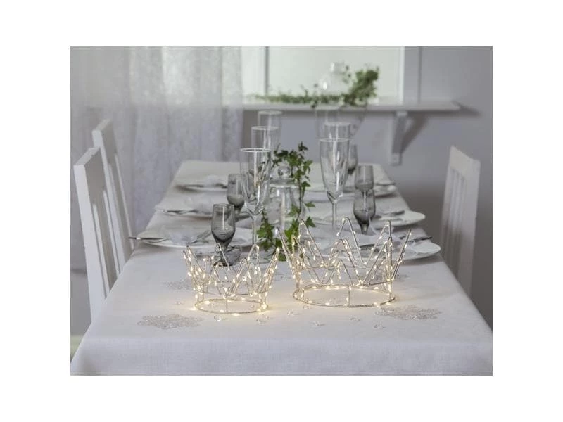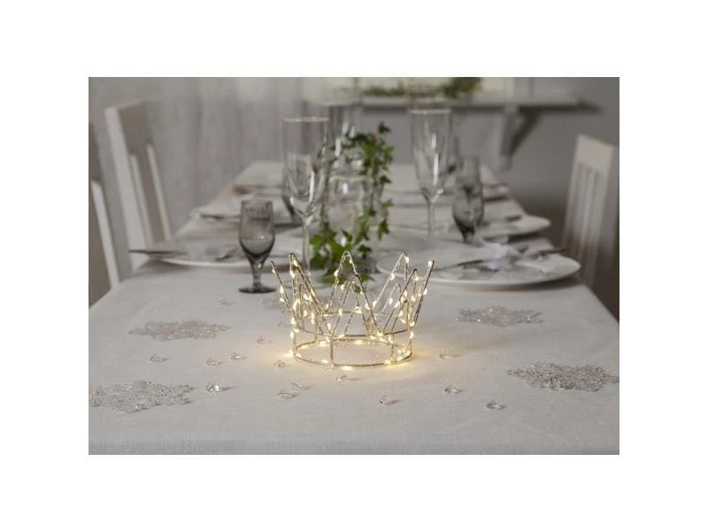 Schöne Innenverzierung in Form einer Krone. Eine Tautropfen-Schleife ist um die Form gewickelt. 70 warmweisse LED-Lichtpunkte, die mit Batterien betrieben werden. Schöne Dekoration für Weihnachten und ein magisches Detail für die Party Tisch decken.