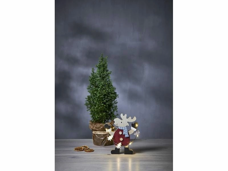 Fröhliches Reh, das eine kleine Lichtschleife hält. Dekorieren Sie das Kinderzimmer für Weihnachten und es leuchtet schön im Fenster und gibt eine gemütliche Weihnachtsatmosphäre.