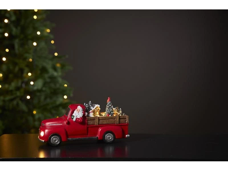 Eine schöne Weihnachtsdekoration, der Weihnachtsmann in seinem roten Lastwagen, beladen mit einer winterlichen Landschaft, die schön glänzt. Alles vermittelt ein gemütliches Weihnachtsgefühl. Der Weihnachtsbaum dreht sich und der Laternenrahmen auf dem Lastwagen leuchtet. Dekorieren Sie für Advent und Weihnachten, passt sowohl das Kinderzimmer und auf einem Regal.
