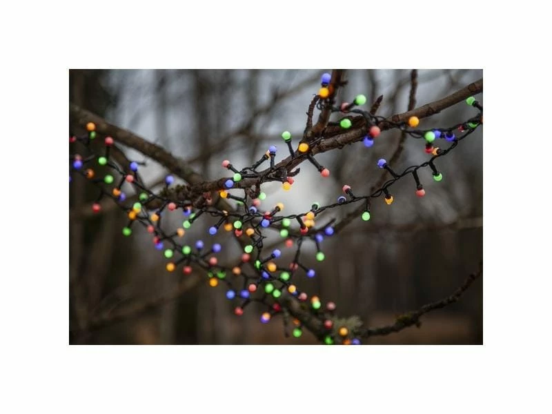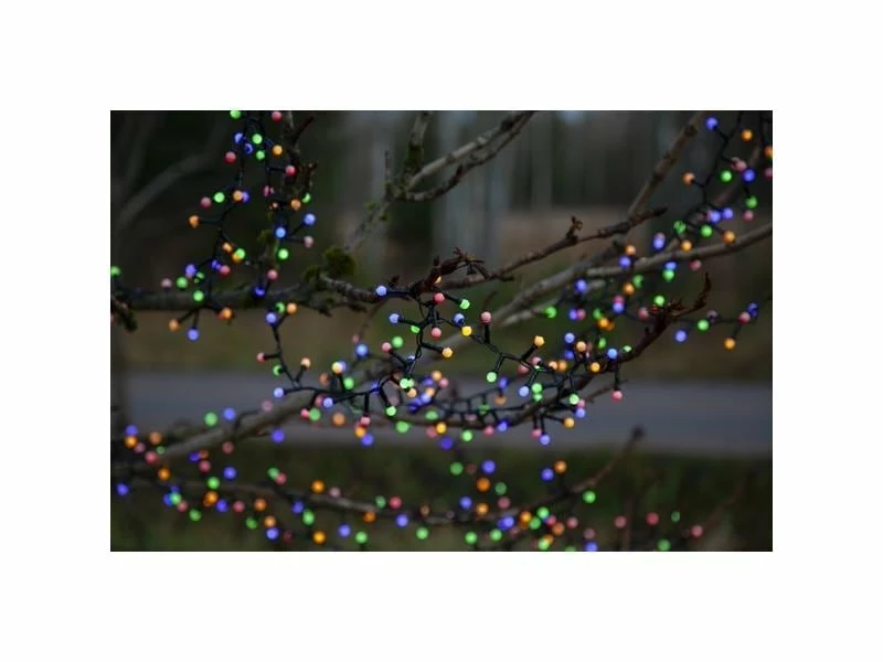 Lichterkette für den Aussenbereich mit 700 LED, mehrfarbiges Licht mit 8-Funktions-Lauflichtbox im Transformator. Wählen Sie zwischen Dauerlicht oder 7 Blinkfunktionen. Kleine runde weisse Abdeckungen geben einen gemütlichen Glanz. 2 cm Abstand zwischen den Glühbirnen. Der Transformator mit IP44-Klassifizierung hat einen eingebauten Timer. Drücken Sie den Knopf drei Sekunden lang, um zu starten, und der Knopf leuchtet grün, wenn der Timer eingeschaltet ist. Die Lichterkette wird in einer Kunststoffbox mit Tragegriff geliefert, perfekt zur Aufbewahrung, wenn die Lichterkette nicht in Gebrauch ist. Eine perfekte Lichterkette für die Dekoration in Ihrem Garten oder auf Ihrer Terrasse.