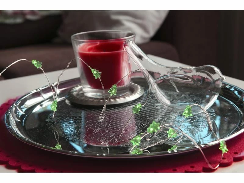 Batteriebetriebene Lichterkette mit Tautropfen und grünen Bäumen. Silbernes Metalldrahtkabel. Kann für verschiedene Dekorationen verwendet werden, z. B. für Blumenarrangements und Tischdekorationen. Die Lichterkette hat 12 grüne LED-Lichtquellen.