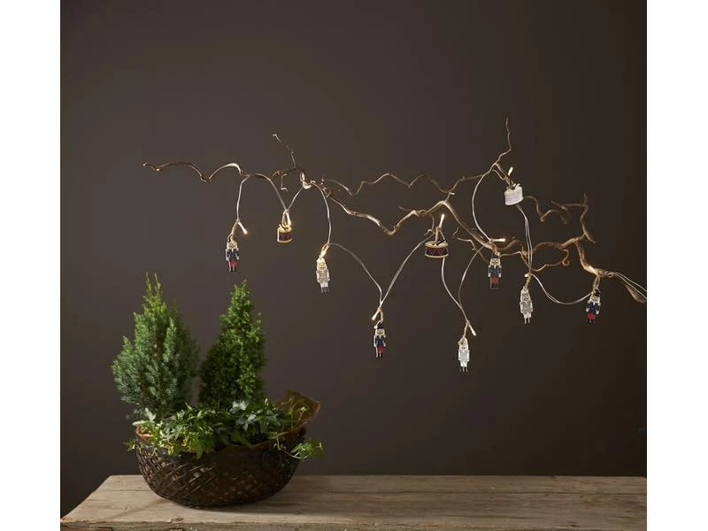 Lichterkette für den Innenbereich, dekoriert mit 10 Holzfiguren. Die Figuren sind mit Hanfseil gebunden. Dekoration, die einen gemütlichen Glanz in der Wohnung gibt. Perfekte Dekoration zusammen mit anderen Artikeln aus Nussknacker-Serie.