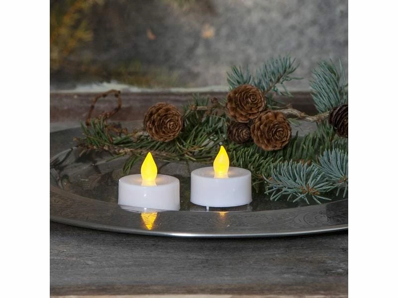 Weisses Teelicht aus der Serie Paulo. Die naturgetreue Flamme leuchtet in einem warmen weissen Schein.