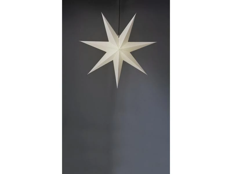 Weisser Papierstern mit schwarzem Textilkabel. Eleganter Stern zum Dekorieren im Haus. Der Stern hat Platz für eine Lichtquelle. Die Höhe beträgt 100 cm.