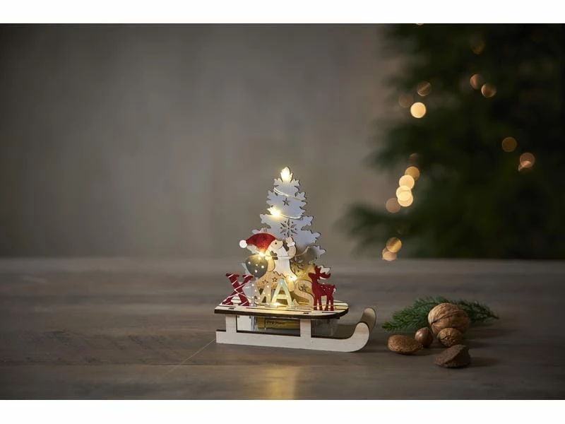 Dekoration mit lasergeschnittenen Details. Weihnachtsmann auf Schlitten für den Innenbereich. 5 LED-Lichter, die schön und stimmungsvoll leuchten. Auf einer Anrichte oder einem Regal platzieren für eine wunderbare Weihnachtsstimmung.