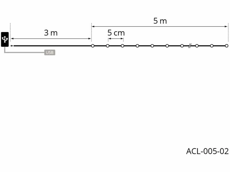 - Länge mit Licht: 5 m, Kabellänge zum Netzteil: 3 m