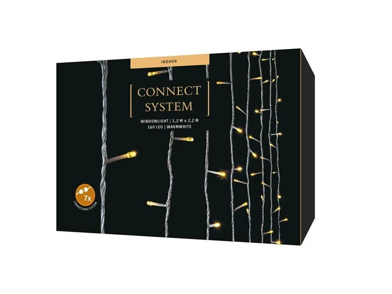 Der Connect Window Lichtvorhang ist ein heller Vorhang, der mit 160 warmweissen LED-Lampen leuchtet. Er ist für die Anwendung im Indoorbereich konzipiert und umfasst insgesammt 8 Stränge, welche in einem regelmässigen Abstand von 17 cm befestigt sind. Diese Stränge haben alle eine Länge von 2 Meter. Der Vorhang zeigt besonders im Winter seine Wirkung und bewirkt eine winterliche Atmosphäre. Die Anzahl LEDs lässt sich übrigens von 160 auf bis zu 1200 erweitern – für eine noch grössere Weihnachtsspielerei.