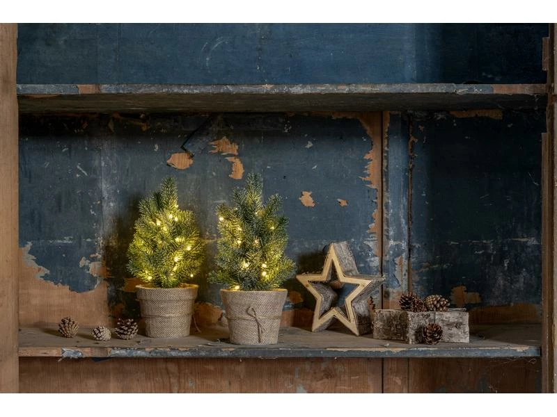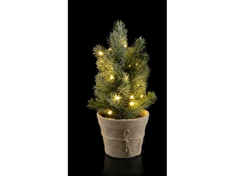 - Süsser Weihnachtsbaum im Topf mit dekorativem Säckchen