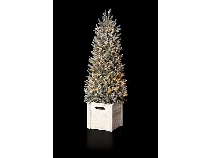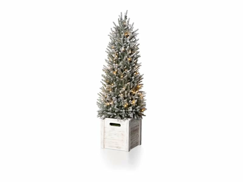 - Verschneiter Weihnachtsbaum in weisser Kiste im Used-Stil